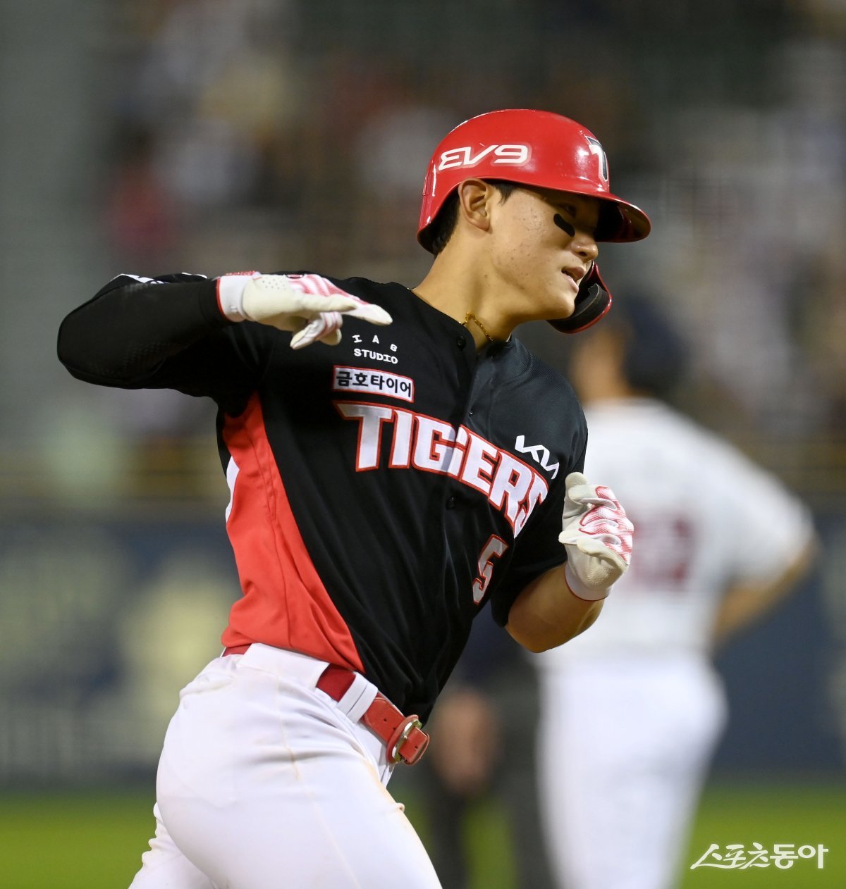 6일 서울 잠실야구장에서 ‘2023 신한은행 SOL KBO리그’ KIA 타이거즈와 두산 베어스 열렸다. 4회초 1사 3루 KIA 김도영이 좌월 투런 홈런을 날리고 그라운드를 돌며 하이파이브 하고 있다.