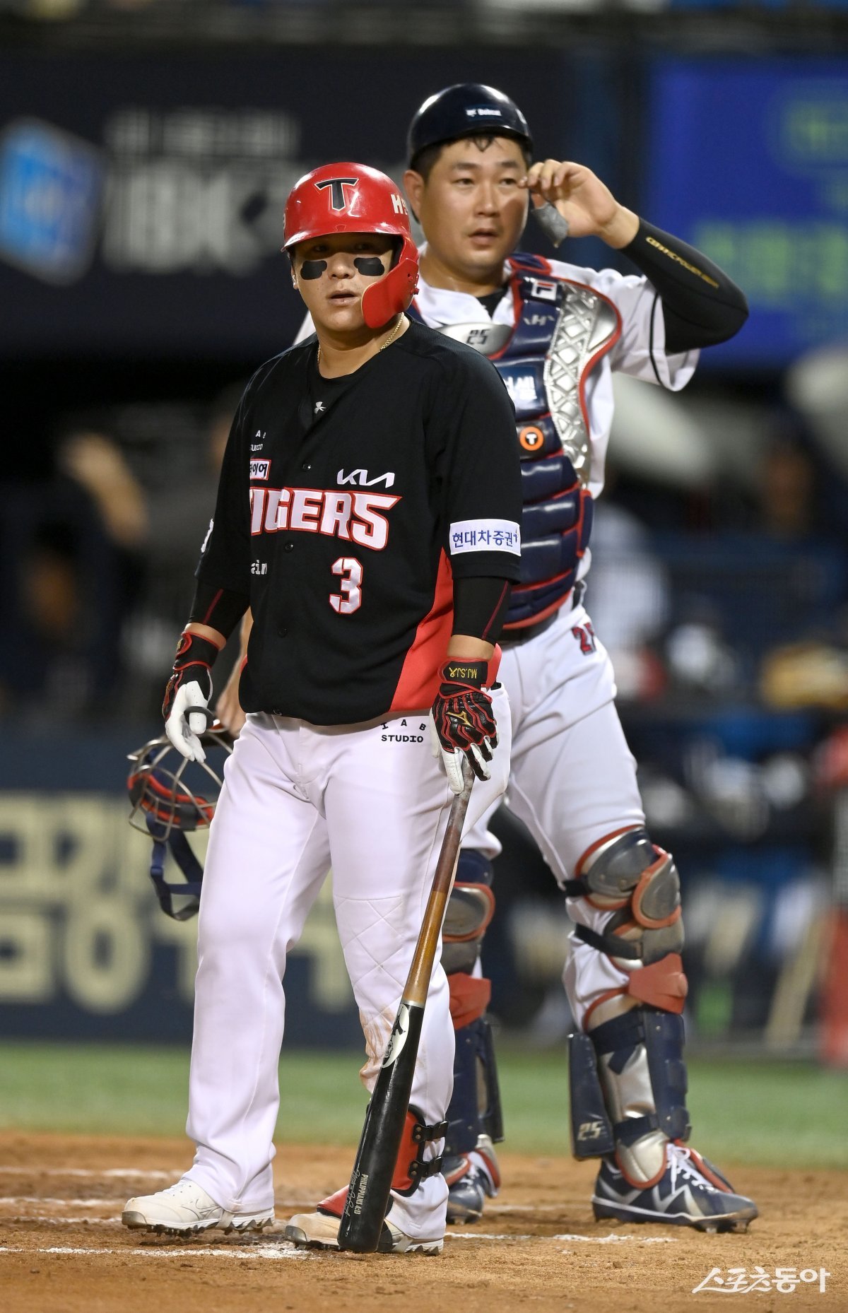 6일 서울 잠실야구장에서 ‘2023 신한은행 SOL KBO리그’ KIA 타이거즈와 두산 베어스 열렸다. 3회초 1사 1,2루 KIA 김선빈이 삼진 아웃을 당한 후 아쉬워하고 있다.