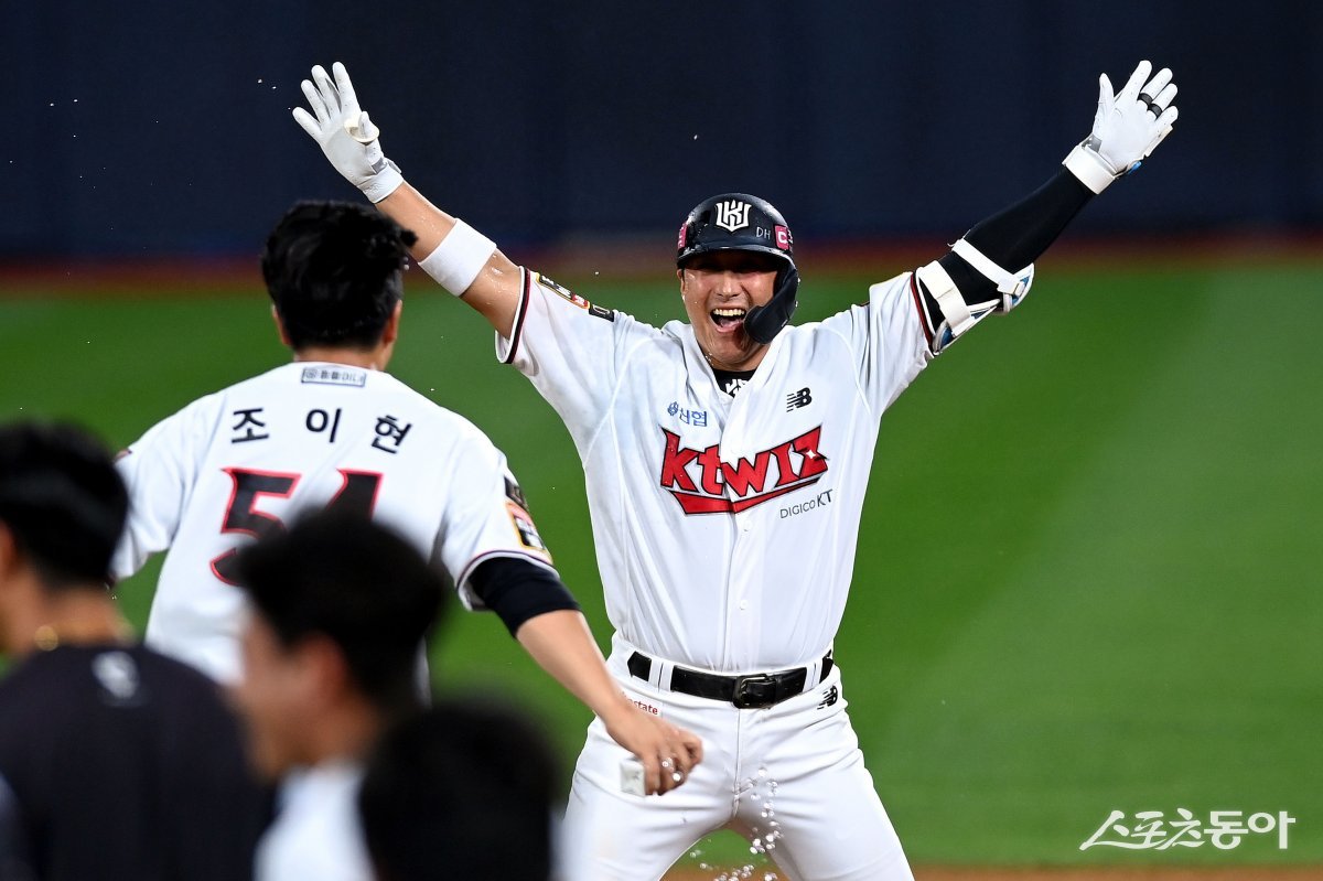 6일 경기도 수원 kt위즈파크에서 ‘2023 신한은행 SOL KBO리그’ kt 위즈와 LG 트윈스의 경기가 열렸다. 9회말 2사 만루에서 kt 황재균이 끝내기 안타를 날린 후 동료들과 기쁨을 나누고 있다.