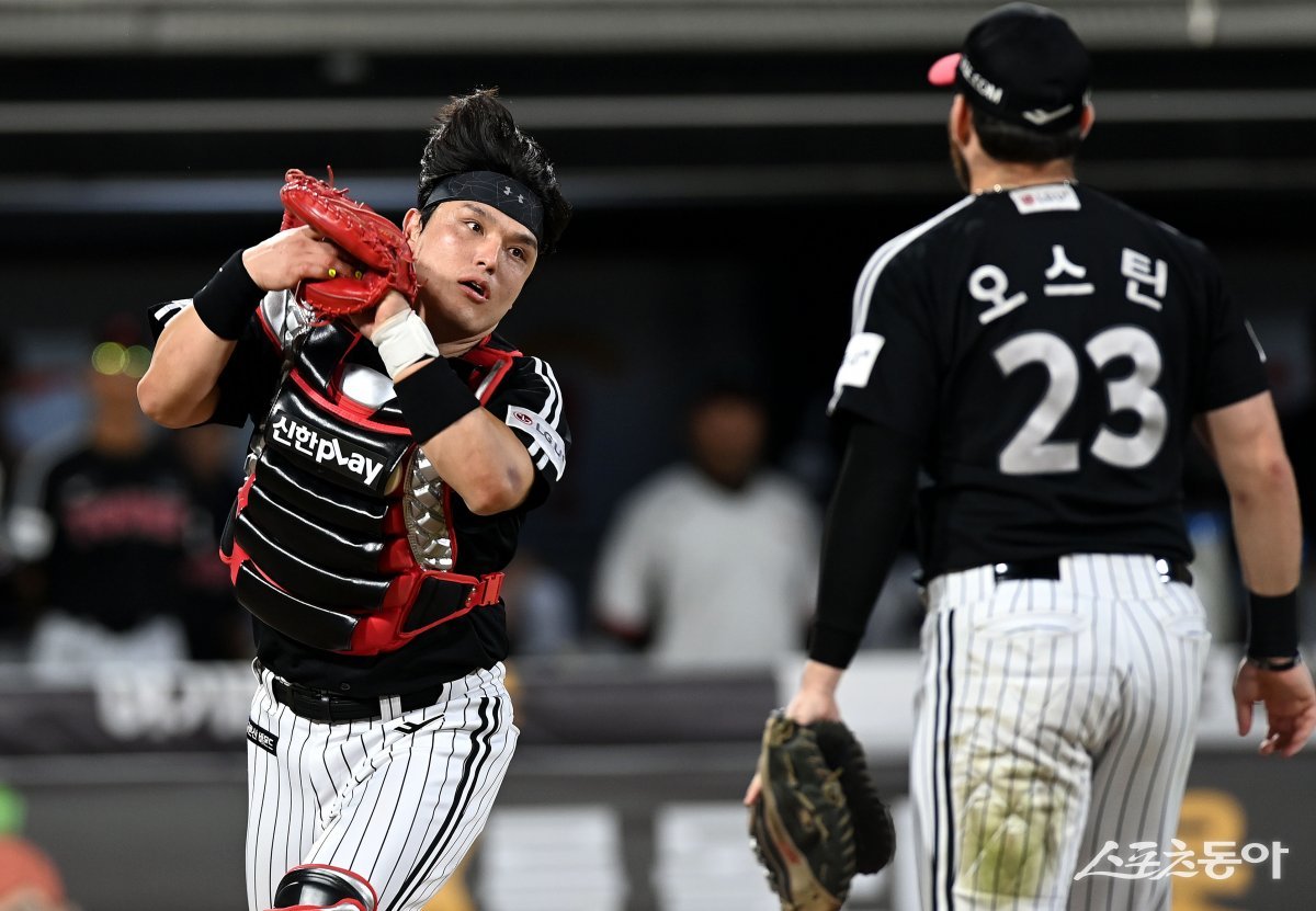 7일 경기도 수원 kt위즈파크에서 ‘2023 신한은행 SOL KBO리그’ kt 위즈와 LG 트윈스의 경기가 열렸다. 6회말 무사 1루에서 LG 박동원이 플라이 타구를 잡아내고 있다.