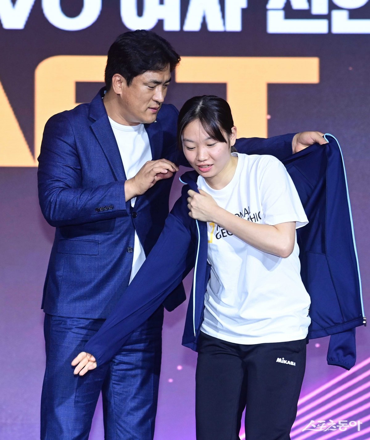10일 서울 강서구 외발산동 메이필드호텔 서울에서 열린 ‘2023-2024 KOVO 여자 신인선수 드래프트’에서 1라운드 4순위 GS칼텍스에 지명된 이윤신이 차상현 감독으로부터 운동복을 받고 있다.