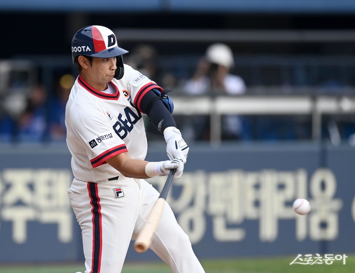10일 서울 잠실야구장에서 ‘2023 신한은행 SOL KBO리그’ 삼성 라이온즈와 두산 베어스 열렸다. 2회말 무사 1,3루 두산 강승호가 선제 2타점 중전 2루타를 치고 있다.