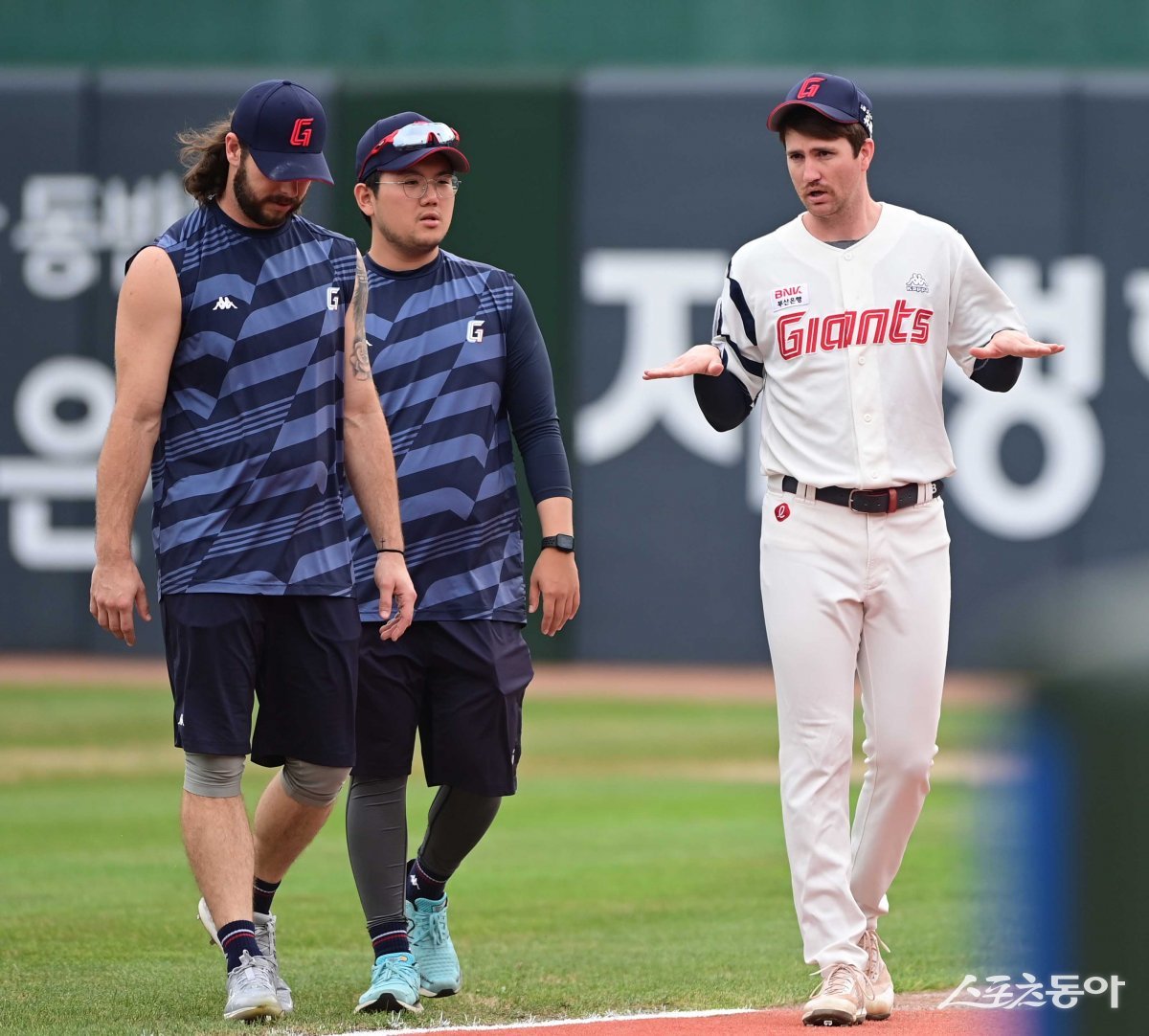 12일 부산 사직야구장에서 열린 ‘2023 신한은행 SOL KBO리그’ 롯데 자이언츠와 NC 다이노스의 경기에 앞서 롯데 반즈가 동료와 이야기를 하고 있다.