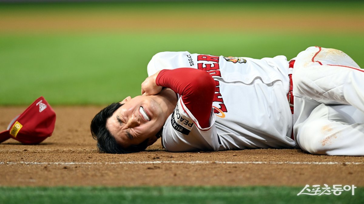 12일 인천 SSG 랜더스필드에서 ‘2023 신한은행 SOL KBO리그’ SSG 랜더스와 kt 위즈의 경기가 열렸다. 7회초 2사에서 SSG 오태곤이 1루 수비를 펼치다 kt 박경수와 충돌 후 고통을 호소하고 있다.