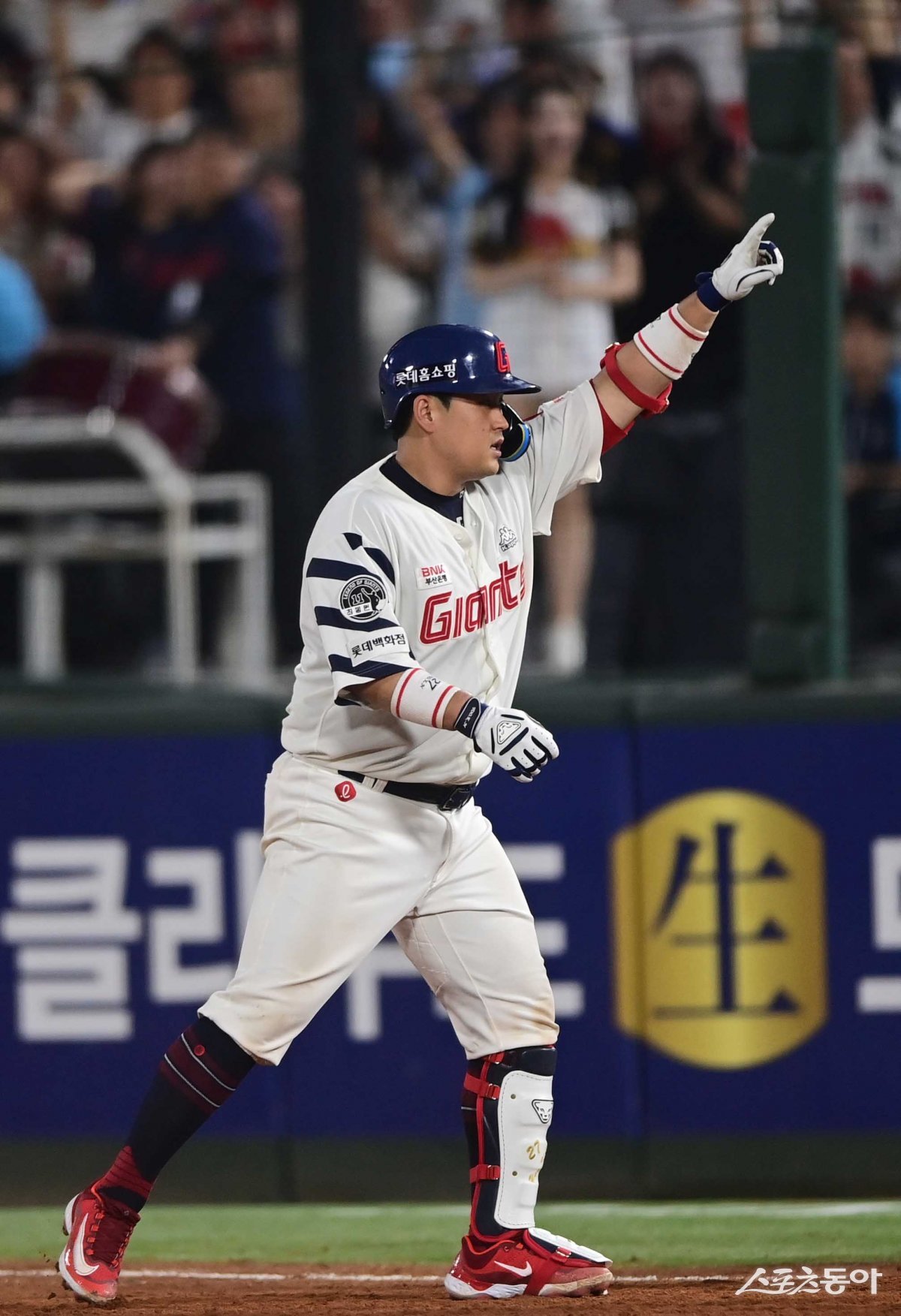 12일 부산 사직야구장에서 열린 ‘2023 신한은행 SOL KBO리그’ 롯데 자이언츠와 NC 다이노스의 경기에서 7회말 2사 2, 3루 롯데 유강남이 동점 2타점 좌전 적시타를 친 후 세리머니를 하고 있다.