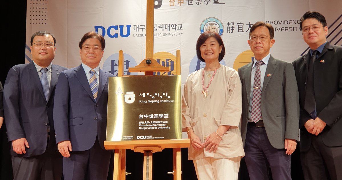 대구가톨릭대는 지난 7일 대만 타이중 징이대학(靜宜大學)에서 세종학당 설립을 위한 현판식을 개최했다. 이날 행사에는 성한기 대구가톨릭대 총장, 린스링 대만 징이대학 총장, 타이중 세종학당 현지 교원 등 관계자 100여 명이 참석했다.