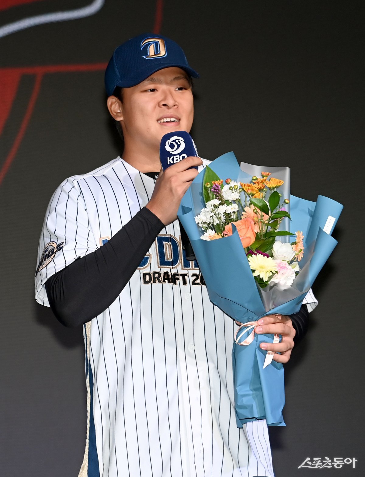 14일 서울 중구 웨스틴조선호텔에서 열린 ‘2024 KBO 신인 드래프트’에서 1라운드 5순위로 NC에 지명된 김휘건(휘문고)이 소감을 말하고 있다.