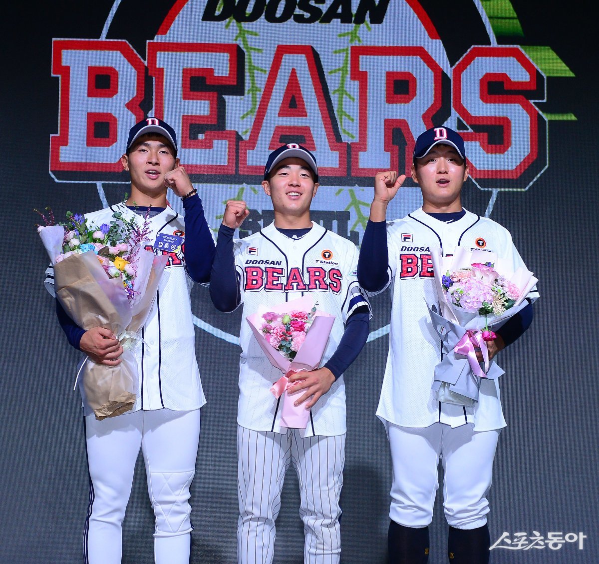 14일 서울 중구 웨스틴조선호텔에서 열린 ‘2024 KBO 신인 드래프트’에서 두산에 지명된 선수들이 기념촬영을 하고 있다.