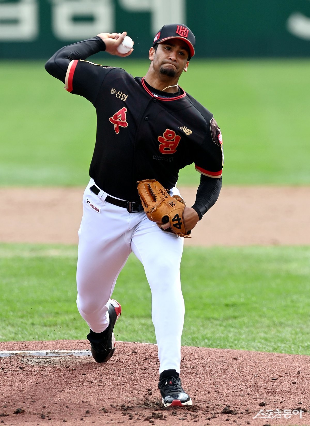 17일 대전 한화생명이글스파크에서 ‘2023 신한은행 SOL KBO리그’ 한화 이글스와 kt 위즈의 DH1차전 경기가 열렸다. kt 선발투수 쿠에바스가 힘차게 볼을 던지고 있다.