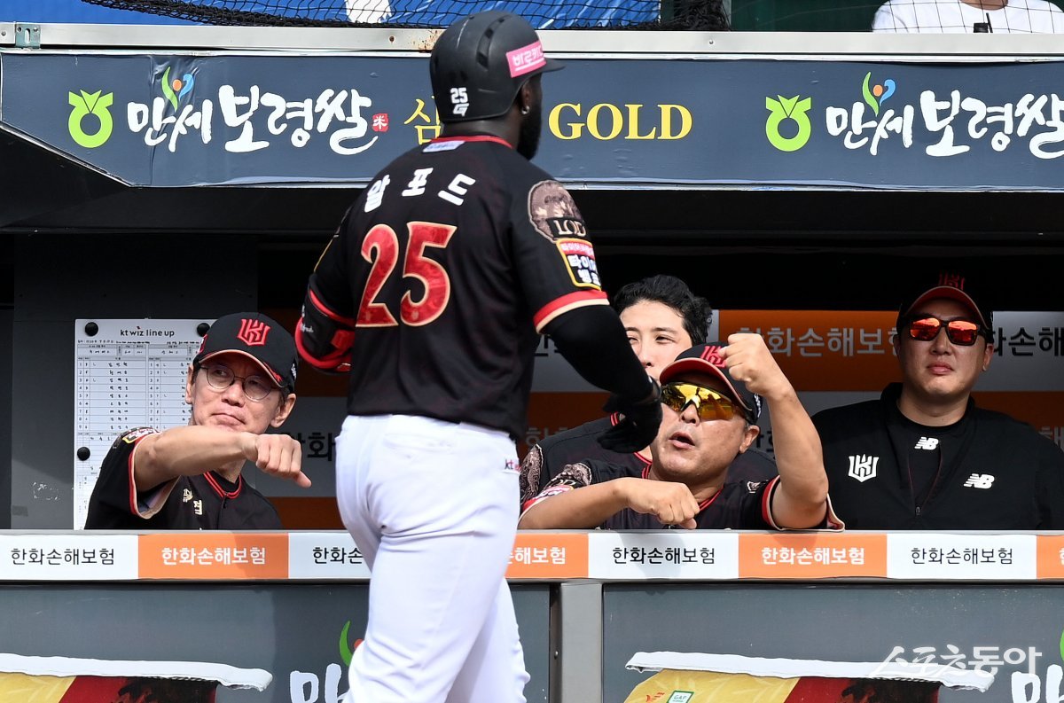17일 대전 한화생명이글스파크에서 ‘2023 신한은행 SOL KBO리그’ 한화 이글스와 kt 위즈의 DH 1차전경기가 열렸다. 4회초 무사 1루에서 kt 알포드가 투런 홈런을 쏘아올린 후 이강철 감독의 환영을 받고 있다.