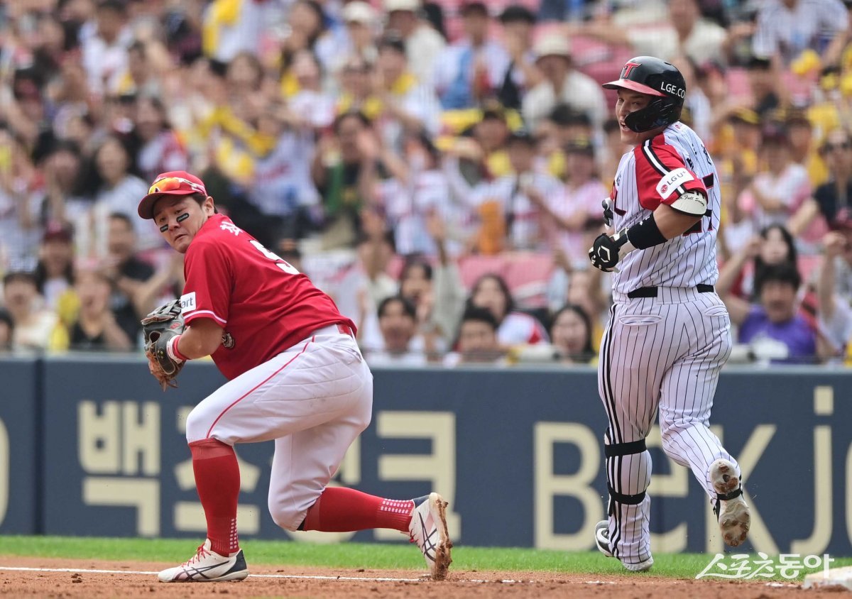 17일 서울 잠실야구장에서 열린 ‘2023 신한은행 SOL KBO리그’ LG 트윈스와 SSG 랜더스의 더블헤더 1차전 경기에서 2회말 2사 2루 땅볼 때 SSG 1루수 최주환이 송구된 볼을 잡은 후 2루주자를 쳐다보고 있다.