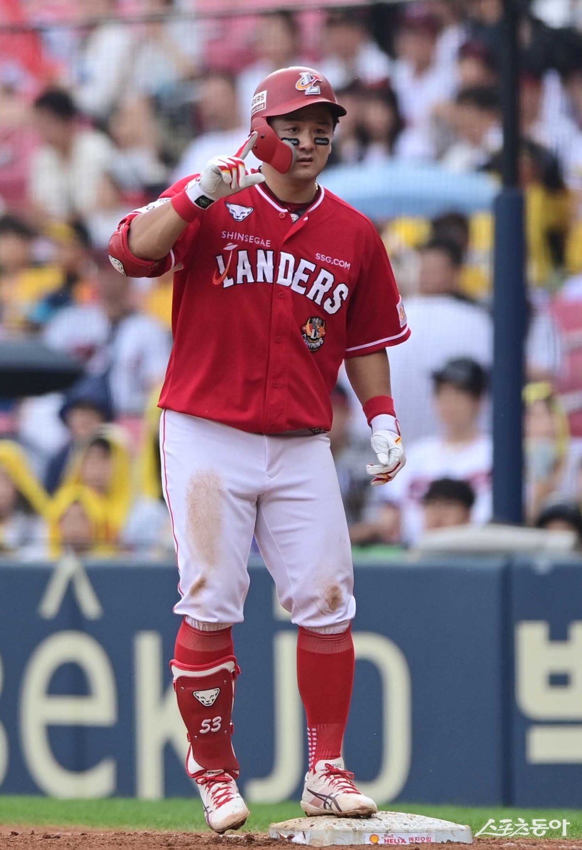 17일 서울 잠실야구장에서 열린 ‘2023 신한은행 SOL KBO리그’ LG 트윈스와 SSG 랜더스의 더블헤더 1차전 경기에서 5회초 2사 1, 3루 SSG 최주환이 1타점 중전 적시타를 친 후 세리머니를 하고 있다.