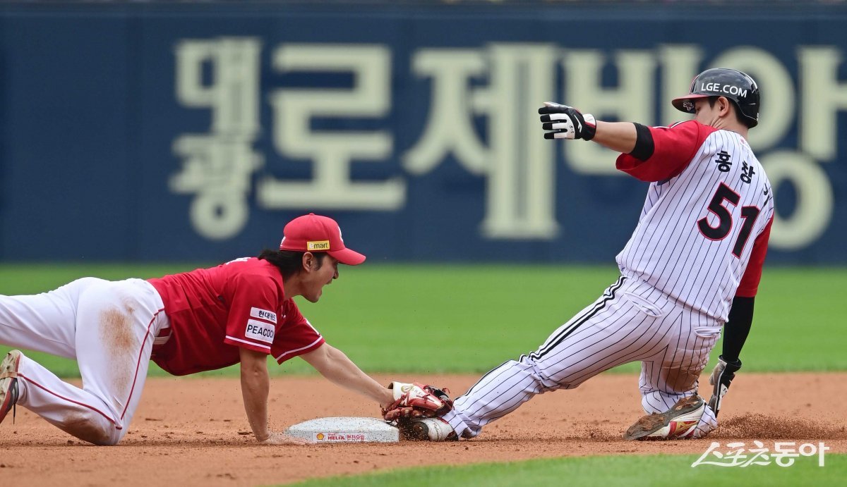 17일 서울 잠실야구장에서 열린 ‘2023 신한은행 SOL KBO리그’ LG 트윈스와 SSG 랜더스의 더블헤더 1차전 경기에서 3회말 2사 1루 상황에서 LG 1루주자 홍창기가 도루를 시도했지만 SSG 2루수 김성현에게 태그 아웃되고 있다.