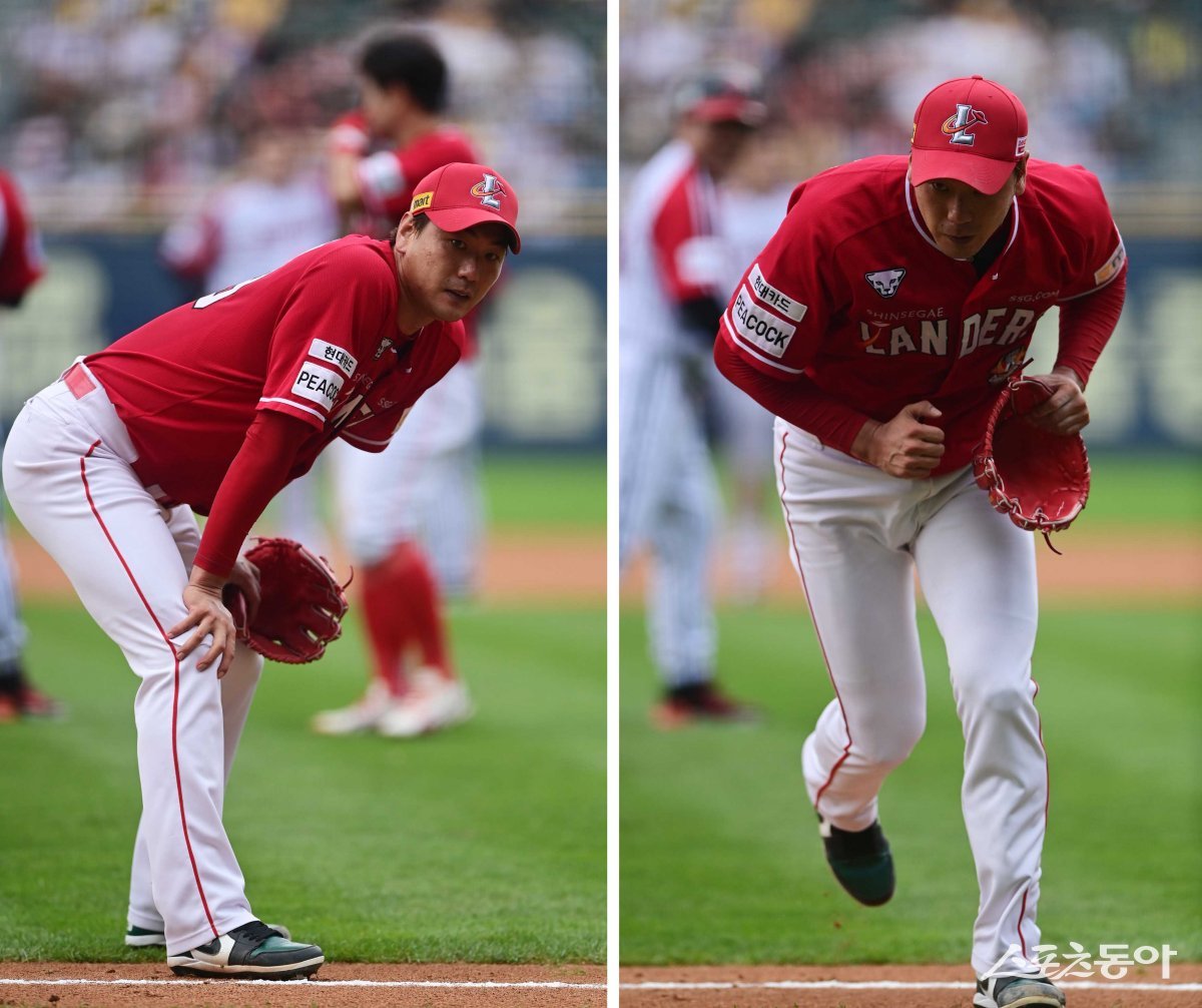 17일 서울 잠실야구장에서 열린 ‘2023 신한은행 SOL KBO리그’ LG 트윈스와 SSG 랜더스의 더블헤더 1차전 경기에서 3회말 2사 1루 LG의 도루에 관련된 비디오판독 때 SSG 김광현이 결과를 기다리며 파울 라인 앞에 서 있다.