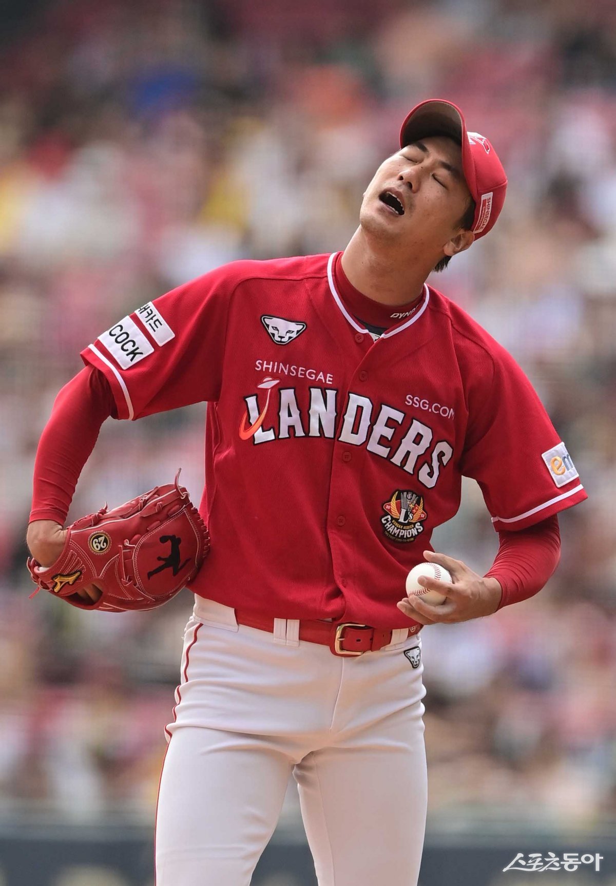 17일 서울 잠실야구장에서 열린 ‘2023 신한은행 SOL KBO리그’ LG 트윈스와 SSG 랜더스의 더블헤더 1차전 경기에서 2회말 1사 LG에 볼넷을 허용한 SSG 김광현이 아쉬워하고 있다.