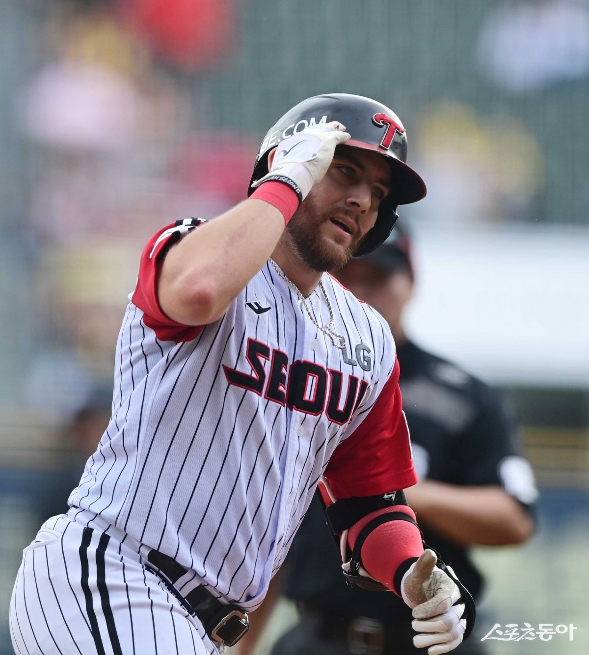 17일 서울 잠실야구장에서 열린 ‘2023 신한은행 SOL KBO리그’ LG 트윈스와 SSG 랜더스의 더블헤더 1차전 경기에서 4회말 1사 LG 오스틴이 동점 중월 솔로 홈런을 친 후 세리머니를 하고 있다.