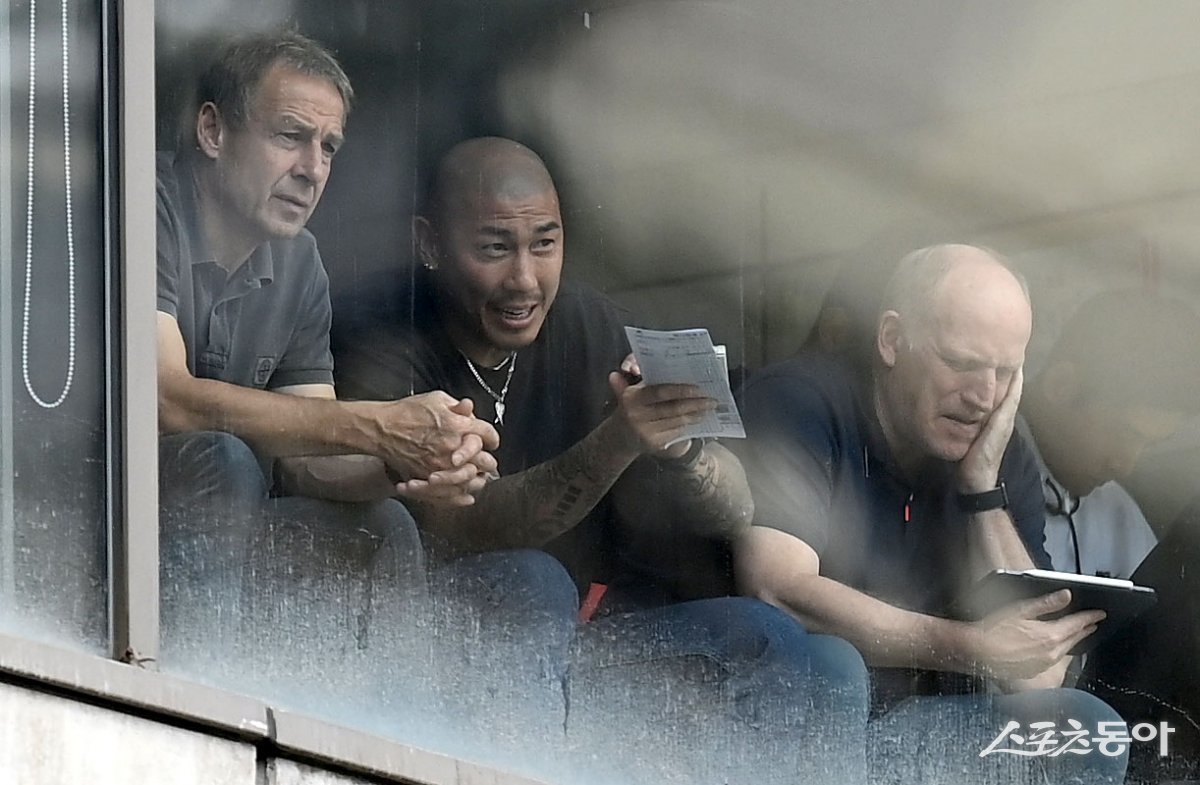 17일 서울월드컵경기장에서 열린 프로축구 ‘하나원큐 K리그1 2023’ FC서울과 광주FC 경기를 클린스만 축구대표팀 감독과 차두리 코치가 관전하고 있다.