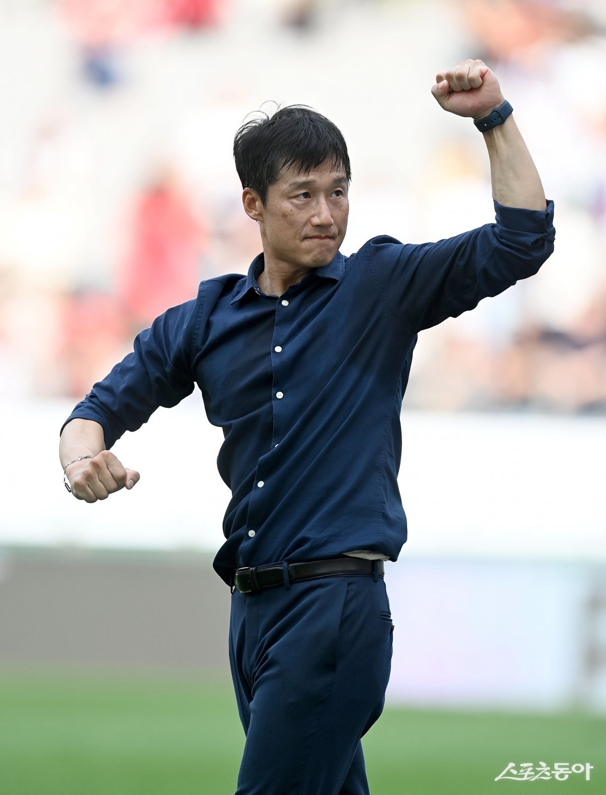 17일 서울월드컵경기장에서 열린 프로축구 ‘하나원큐 K리그1 2023’ FC서울과 광주FC 경기에서 1-0 승리를 거둔 광주 이정효 감독이 기뻐하고 있다.