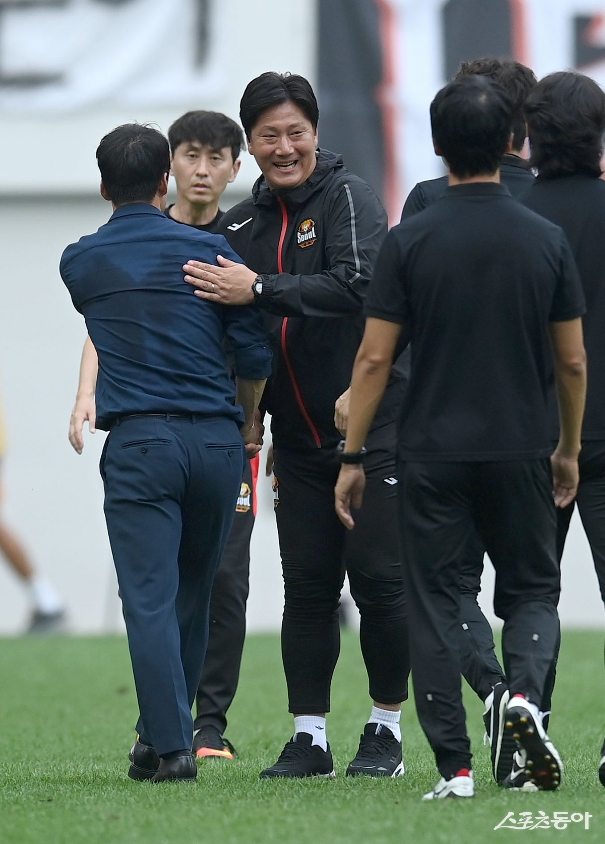 17일 서울월드컵경기장에서 열린 프로축구 ‘하나원큐 K리그1 2023’ FC서울과 광주FC 경기 종료 후 서울 김진규 감독대행과 이정효 감독이 인사를 하고 있다.