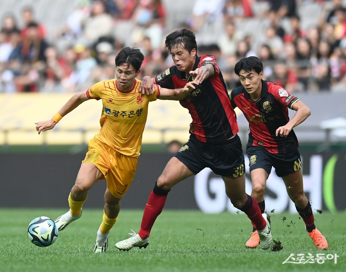 17일 서울월드컵경기장에서 열린 프로축구 ‘하나원큐 K리그1 2023’ FC서울과 광주FC 경기에서 광주 엄지성이 서울 김주성의 수비를 뚫고 공격하고 있다.