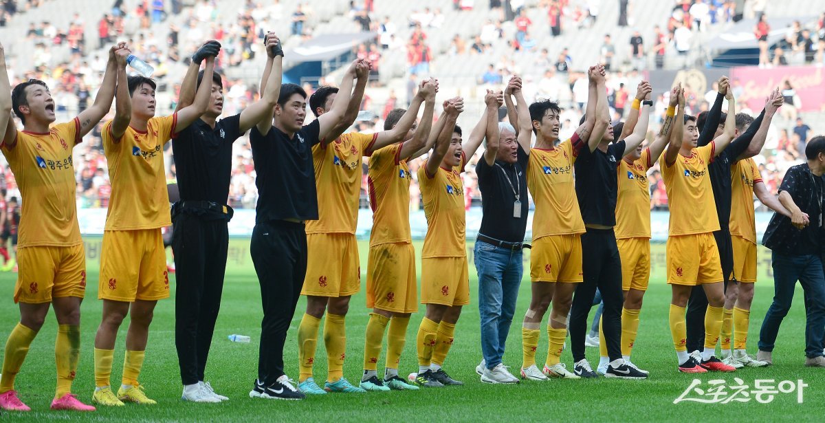 17일 서울월드컵경기장에서 열린 프로축구 ‘하나원큐 K리그1 2023’ FC서울과 광주FC 경기에서 1-0 승리를 거둔 광주 선수들이 기뻐하고 있다.