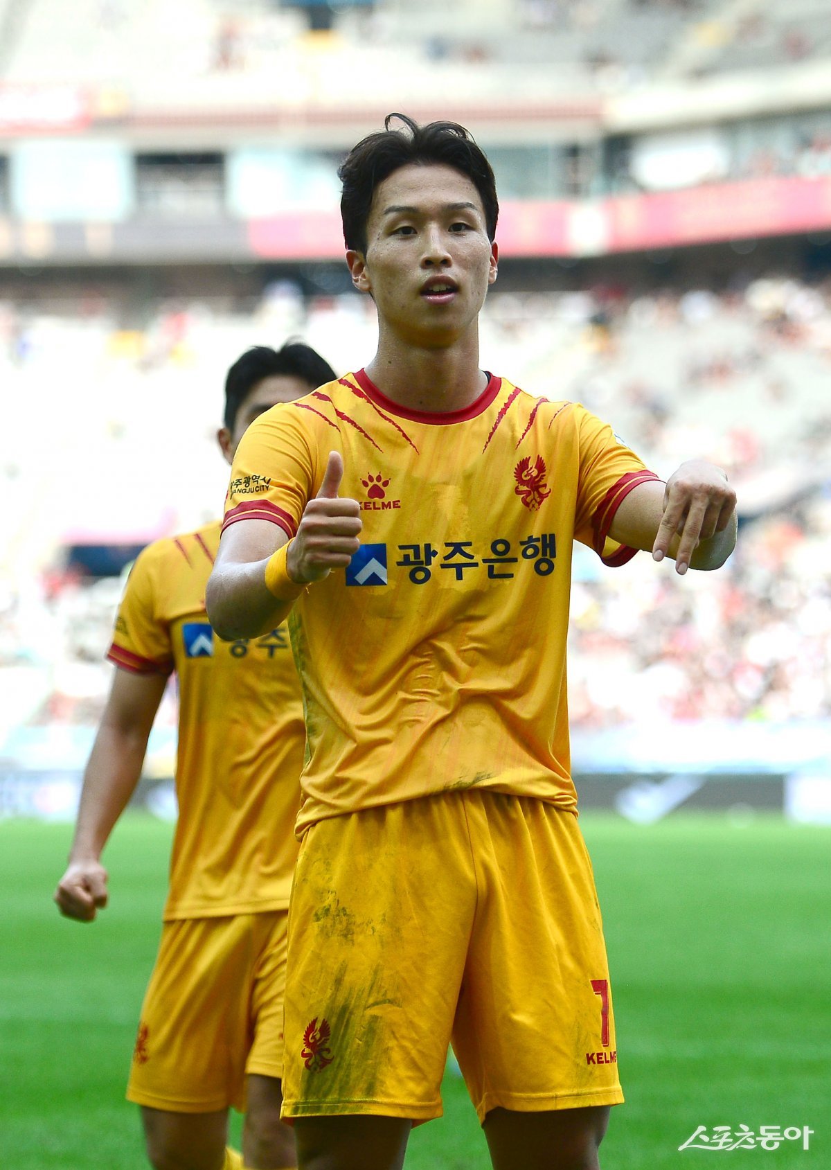 17일 서울월드컵경기장에서 열린 프로축구 ‘하나원큐 K리그1 2023’ FC서울과 광주FC 경기에서 광주 엄지성이 골을 성공시킨 후 기뻐하고 있다. 하지만 비디오판독 결과 노골 판정.