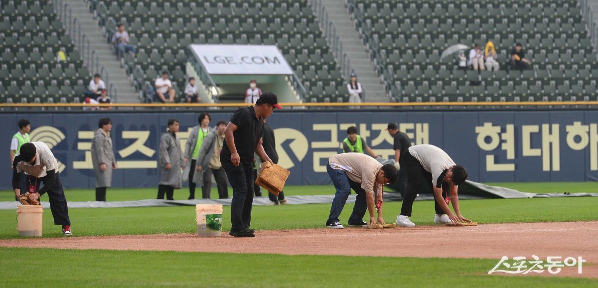 17일 서울 잠실야구장에서 열린 ‘2023 신한은행 SOL KBO리그’ LG 트윈스와 SSG 랜더스의 더블헤더 1차전 경기에서 구장 관리인들이 그라운드 정비를 하고 있다.