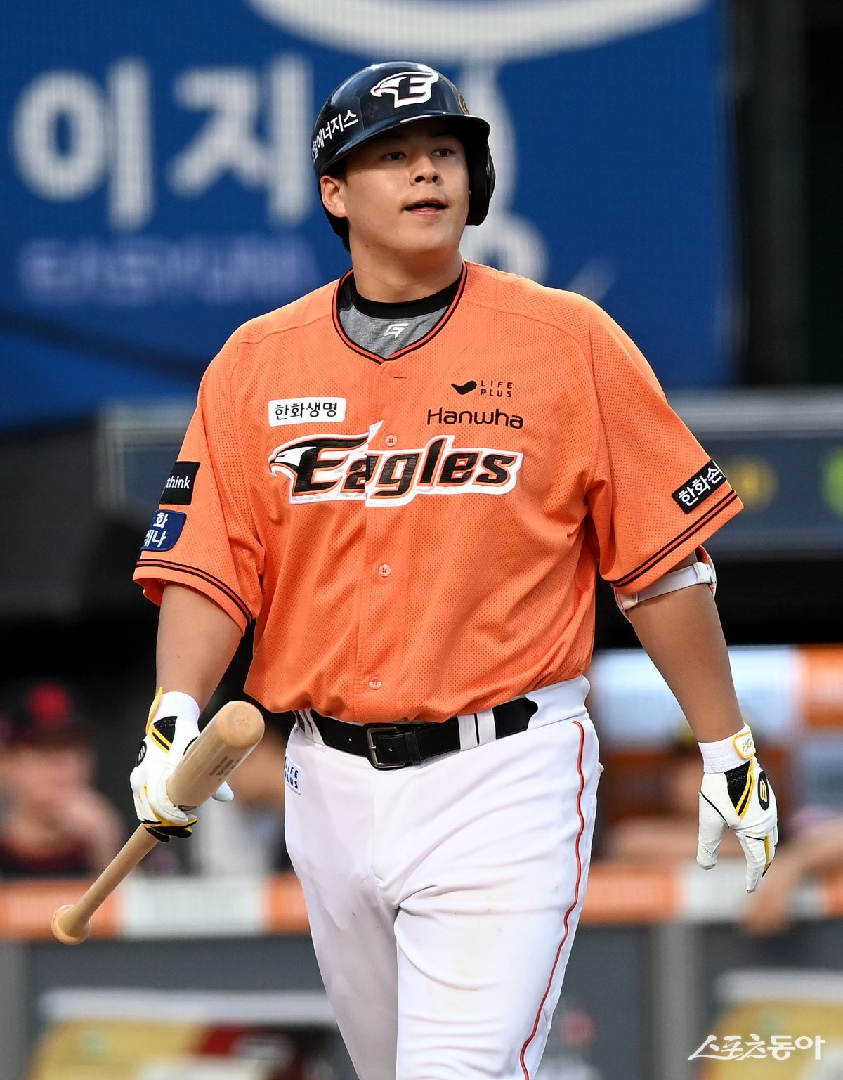 17일 대전 한화생명이글스파크에서 ‘2023 신한은행 SOL KBO리그’ 한화 이글스와 kt 위즈의 DH 2차전 경기가 열렸다. 3회말 1사 만루에서 한화 노시환이 삼진 아웃으로 물러나고 있다.