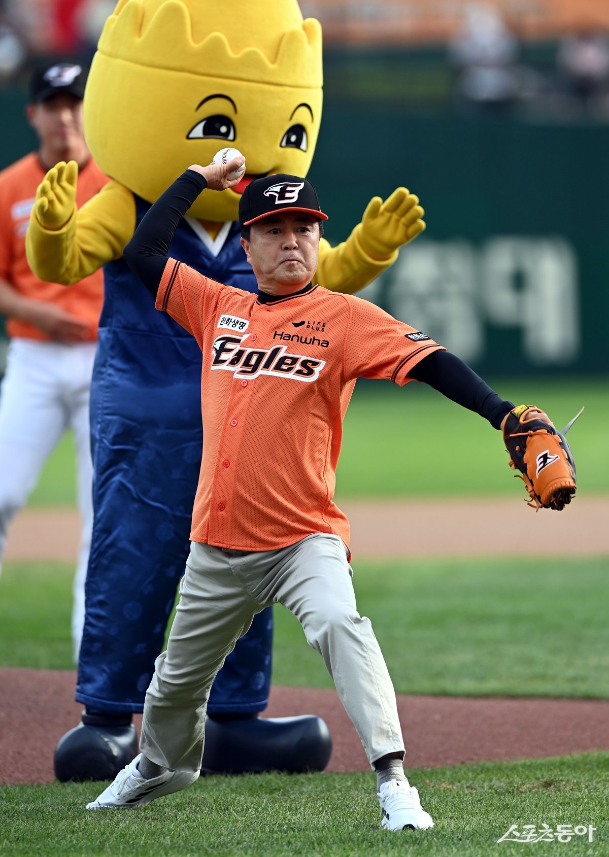 17일 대전 한화생명이글스파크에서 ‘2023 신한은행 SOL KBO리그’ 한화 이글스와 kt 위즈의 DH 2차전 경기가 열렸다. 김태흠 충청남도 도지사가 시구를 던지고 있다.