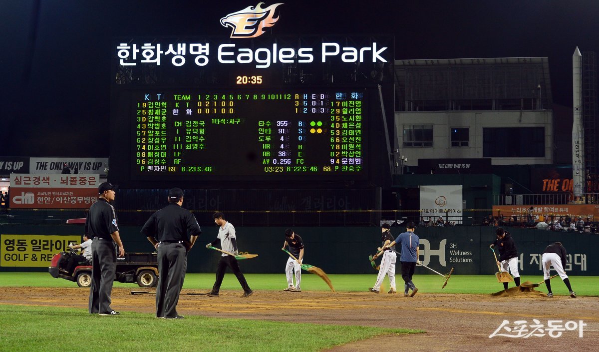 17일 대전 한화생명이글스파크에서 ‘2023 신한은행 SOL KBO리그’ 한화 이글스와 kt 위즈의 DH 2차전 경기가 열렸다. 5회말 갑작스런 폭우에 경기가 중단 후 비가 그치자 한화 관계자들이 그라운드를 정리하는 모습을 심판이 걱정스럽게 바라보고 있다. 우천 중단 후 2시간이 지나며 역대 최장시간 우천중단을 기록했다.