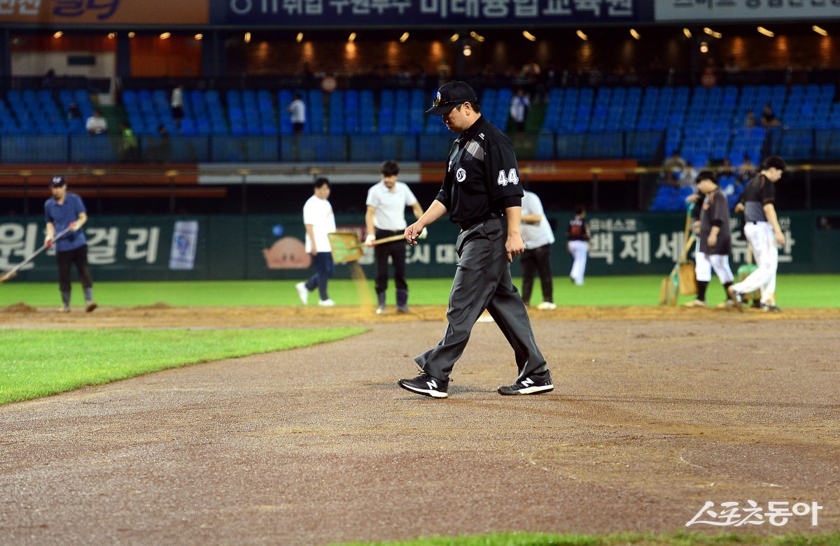 17일 대전 한화생명이글스파크에서 ‘2023 신한은행 SOL KBO리그’ 한화 이글스와 kt 위즈의 DH 2차전 경기가 열렸다. 5회말 갑작스런 폭우에 경기가 중단 후 비가 그치자 심판이 그라운드를 살펴보고 있다.