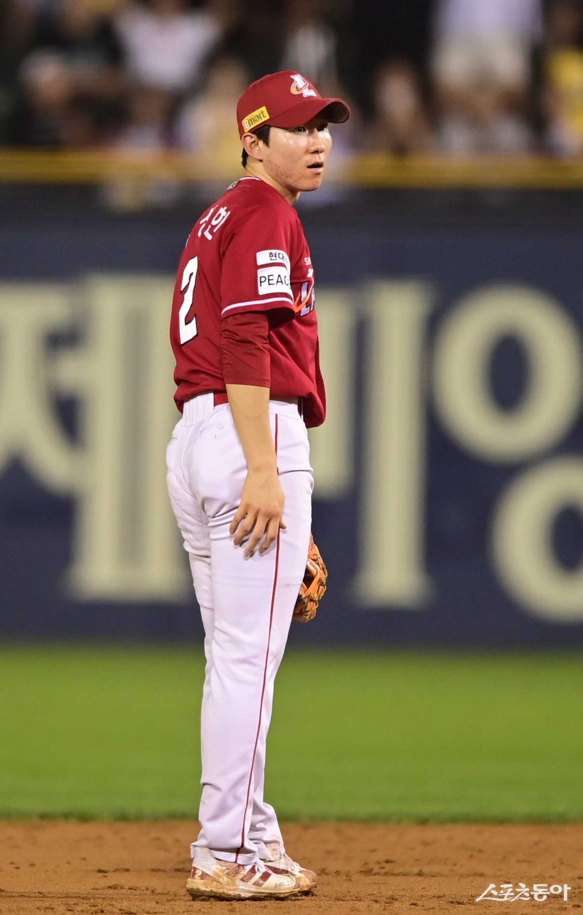 17일 서울 잠실야구장에서 열린 ‘2023 신한은행 SOL KBO리그’ LG 트윈스와 SSG 랜더스의 더블헤더 2차전 경기에서 4회말 2사 1, 3루 LG의 내야 땅볼 때 SSG 유격수 박성한이 포구 실책으로 실점한 후 아쉬워하고 있다.