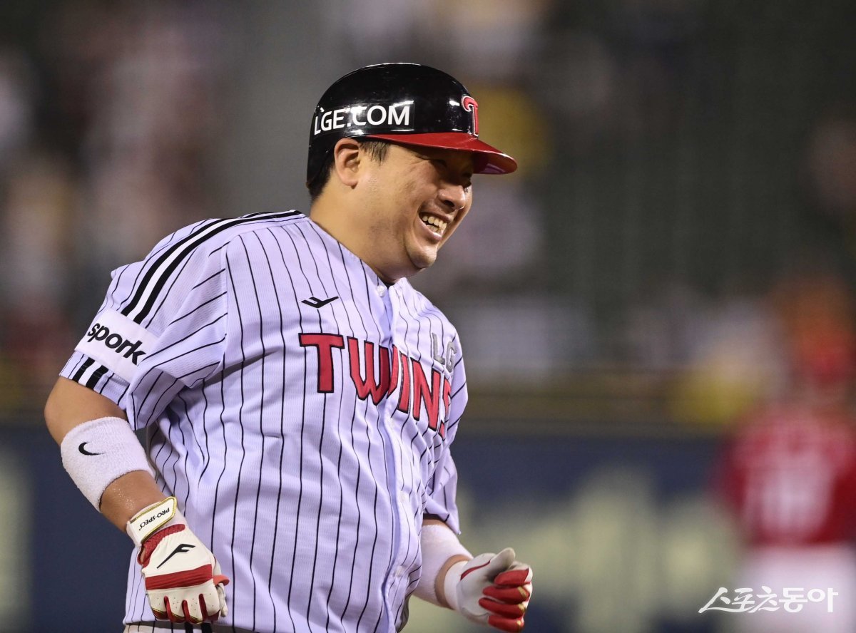 17일 서울 잠실야구장에서 열린 ‘2023 신한은행 SOL KBO리그’ LG 트윈스와 SSG 랜더스의 더블헤더 2차전 경기에서 4회말 1사 LG 허도환이 좌월 솔로 홈런을 친 후 기뻐하고 있다.