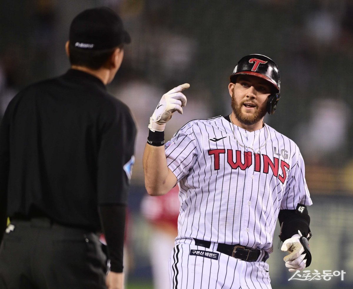 17일 서울 잠실야구장에서 열린 ‘2023 신한은행 SOL KBO리그’ LG 트윈스와 SSG 랜더스의 더블헤더 2차전 경기에서 4회말 2사 1루 LG 오스틴이 1타점 중전 3루타를 친 후 심판에게 홈런 여부를 확인하고 있다.