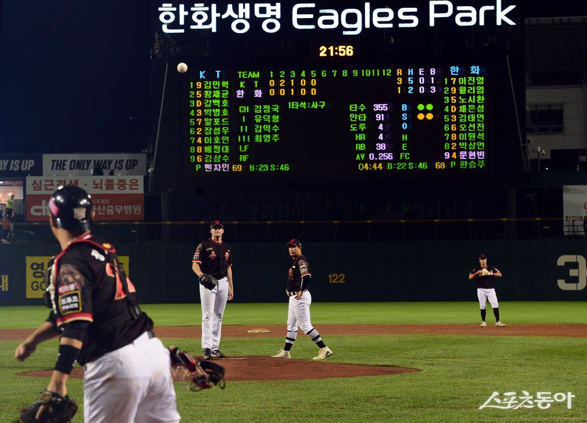 17일 대전 한화생명이글스파크에서 ‘2023 신한은행 SOL KBO리그’ 한화 이글스와 kt 위즈의 DH 2차전 경기가 열렸다. 5회말 갑작스런 폭우에 경기가 204분동안 중단 후 선수들이 경기를 준비하고 있다. 이날 204분 우천 중단은 역대 최장시간 기록했다.