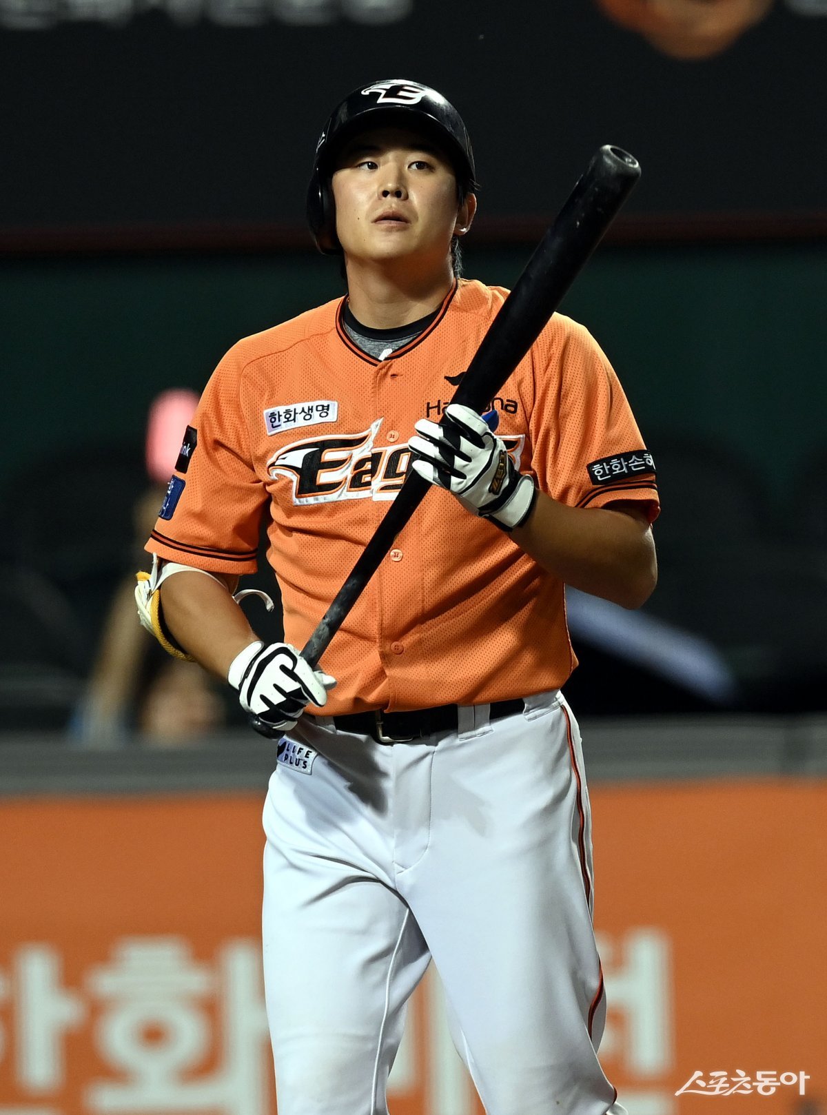 17일 대전 한화생명이글스파크에서 ‘2023 신한은행 SOL KBO리그’ 한화 이글스와 kt 위즈의 DH 2차전 경기가 열렸다. 6회말 2사 1루에서 한화 대타 정은원이 삼진 아웃으로 물러나고 있다.