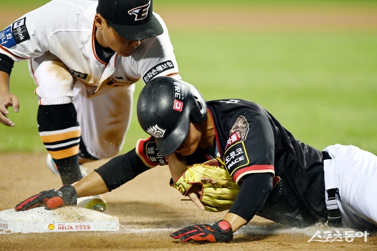 18일 대전 한화생명이글스파크에서 ‘2023 신한은행 SOL KBO리그’ 한화 이글스와 kt 위즈의 경기가 열렸다. 5회초 2사 2, 3루에서 kt 3루 주자 신본기가 볼이 빠지자 홈으로 달리려다 황급히 3루로 귀루하고 있다.