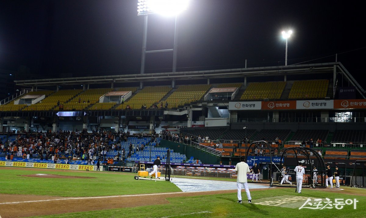 18일 대전 한화생명이글스파크에서 ‘2023 신한은행 SOL KBO리그’ 한화 이글스와 kt 위즈의 경기가 열렸다. 경기 종료 후 한화 선수들이 야간 특타를 진행하고 있다.