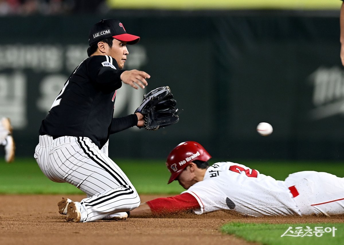 21일 인천 SSG 랜더스필드에서 ‘2023 신한은행 SOL KBO리그’ SSG 랜더스와 LG 트윈스의 경기가 열렸다. 4회말 2사 1루에서 SSG 박성한이 LG 문보경의 태그를 피해 2루 도루를 성공시키고 있다.