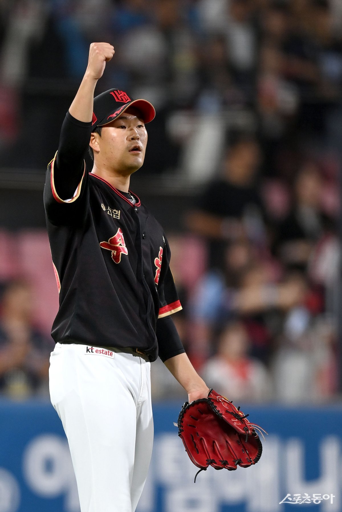 21일 수원 KT위즈파크에서 ‘2023 신한은행 SOL KBO리그’ 롯데 자이언츠와 KT 위즈 경기가 열렸다. 9회말 등판해 무실점으로 막은 KT 김영현이 주먹을 쥐고 있다.