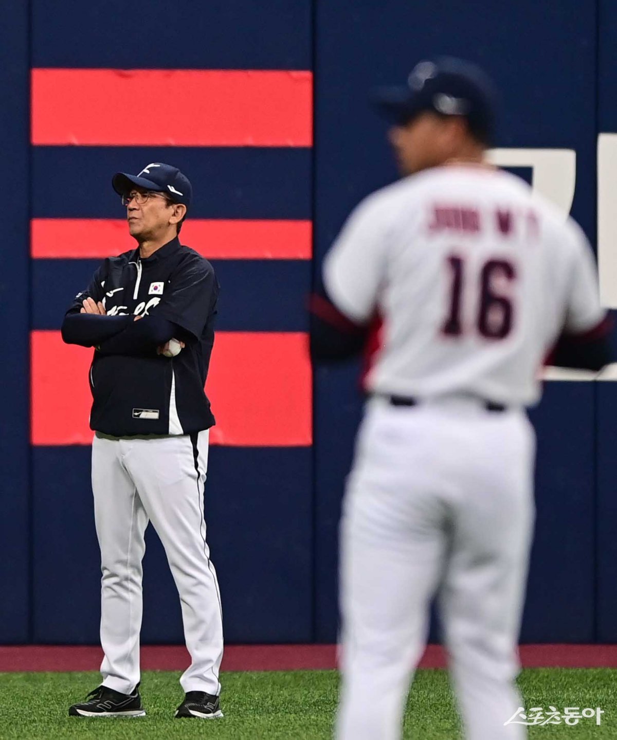 23일 서울 고척스카이돔에서 ‘제19회 항저우 아시안게임’ 한국 야구대표팀 훈련이 열렸다. 한국 최일언 코치가 선수들의 훈련을 지켜보고 있다.