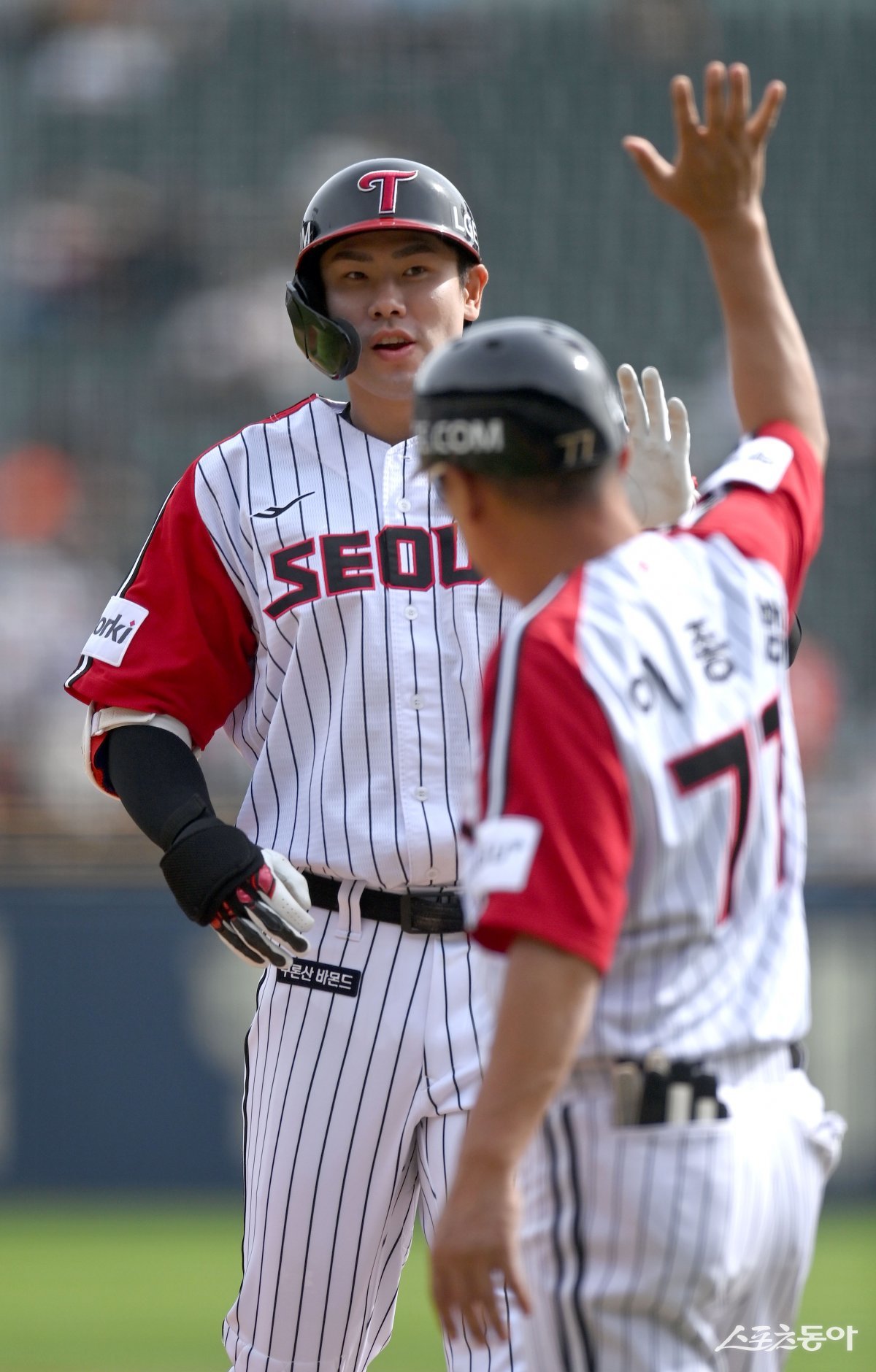 24일 서울 잠실야구장에서 ‘2023 신한은행 SOL KBO리그’ 한화 이글스와 LG 트윈스 경기가 열렸다. 3회말 2사 2루 LG 홍창기가 선제 1타점 적시타를 치고 1루에서 하이파이브 하고 있다.