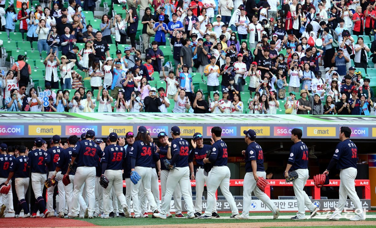 24일 인천 SSG 랜더스필드에서 ‘2023 신한은행 SOL KBO리그’ SSG 랜더스와 롯데 자이언츠의 경기가 열렸다. 롯데가 SSG를 상대로 8-1 승리를 거둔 후 선수들이 그라운드에서 기쁨을 나누고 있다.