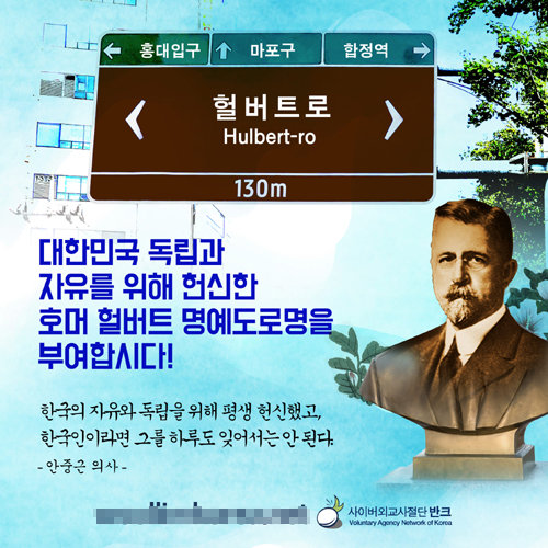 사이버외교사절단 반크가 10월 한글날을 앞두고 외국인 독립운동가 호머 헐버트 박사의 업적을 기리는 명예도로 지정 캠페인에 착수한다.