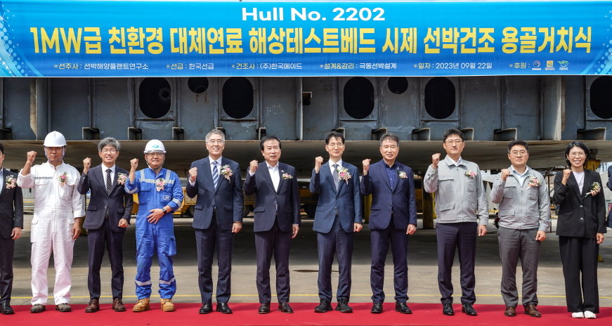 전남 목포시가 최근 친환경선박 기술개발 지원을 위한 핵심 시설인 친환경 대체연료 해상테스트베드의 용골거치식을 개최했다.친환경 선박 기술개방¤상용화 가속도