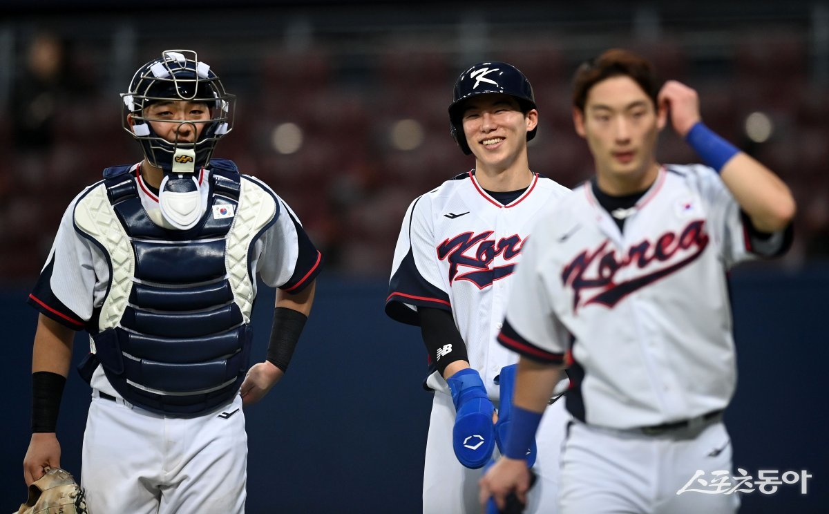 아시안게임에 참가하는 한국 야구대표팀이 26일 서울 고척스카이돔에서 상무와 연습 경기를 가졌다. 경기 종료 후 대표팀 김혜성이 웃고 있다.