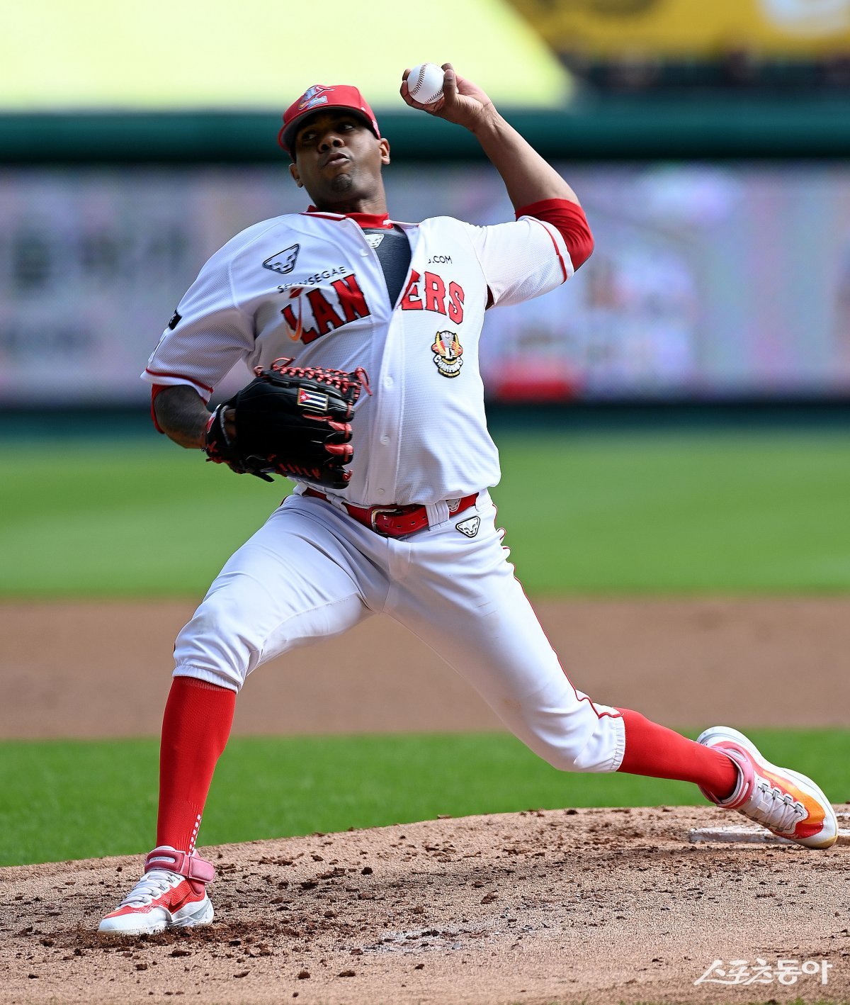 3일 인천 SSG 랜더스필드에서 ‘2023 신한은행 SOL KBO리그’ SSG 랜더스와 NC 다이노스의 경기가 열렸다. SSG 선발투수 엘리아스가 힘차게 볼을 던지고 있다.