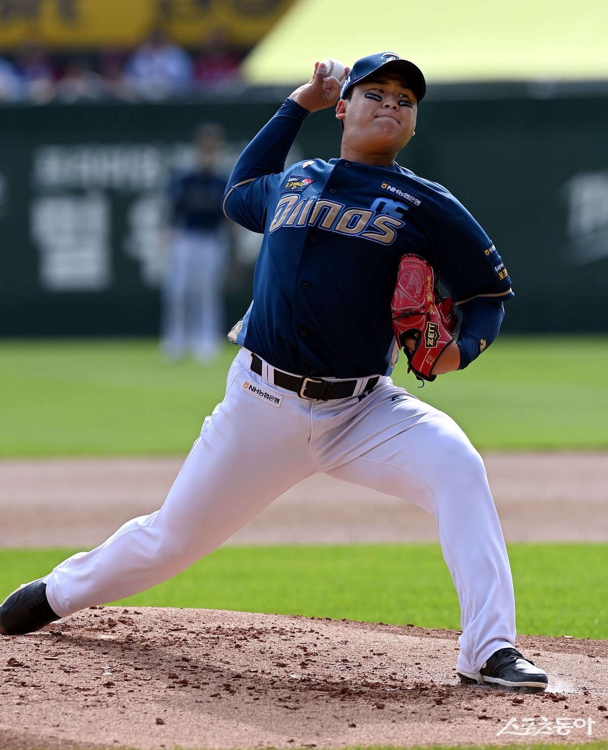 3일 인천 SSG 랜더스필드에서 ‘2023 신한은행 SOL KBO리그’ SSG 랜더스와 NC 다이노스의 경기가 열렸다. NC 선발투수 신민혁이 힘차게 볼을 던지고 있다.