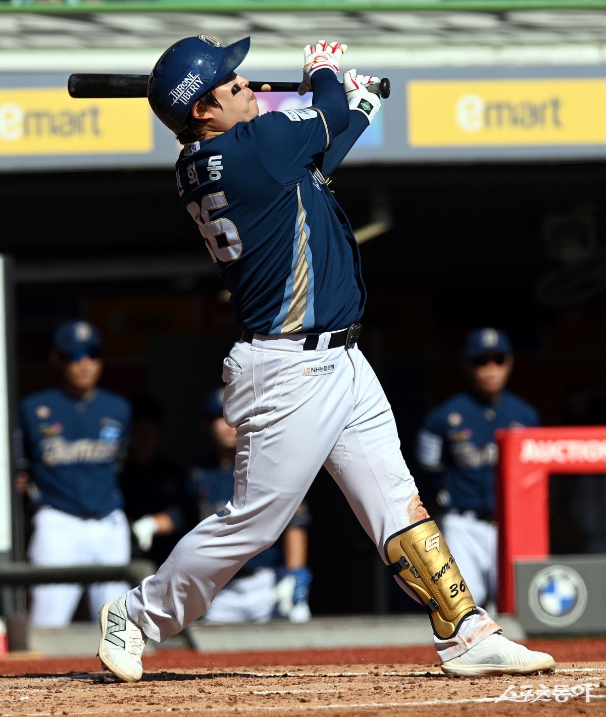 3일 인천 SSG 랜더스필드에서 ‘2023 신한은행 SOL KBO리그’ SSG 랜더스와 NC 다이노스의 경기가 열렸다. 3회초 1사 1루에서 NC 권희동이 투런 홈런을 쏘아 올린 후 코치의 환영을 받고 있다.