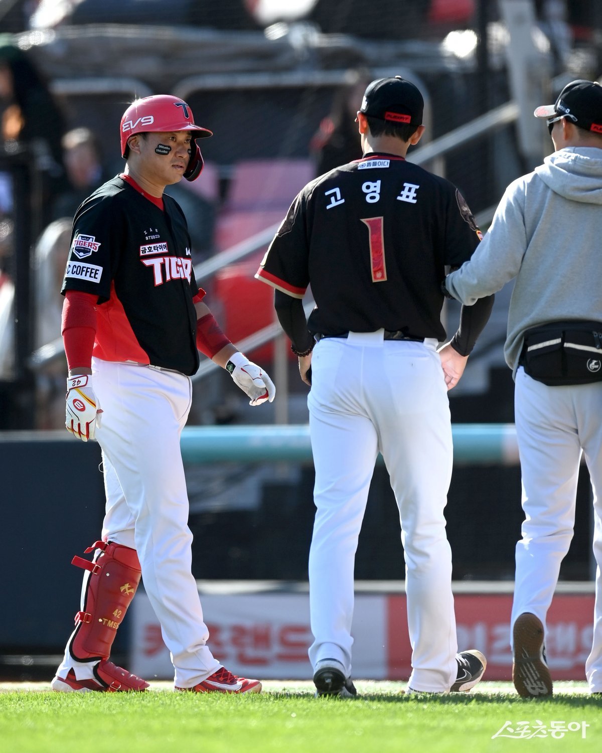 3일 수원 KT위즈파크에서 ‘2023 신한은행 SOL KBO리그’ KIA 타이거즈와 KT 위즈 경기가 열렸다. 선발 투수로 등판한 KT 고영표가 5회초 2사 상황에서 KIA 김태군의 타구에 맞은 후 사과를 받고 있다.